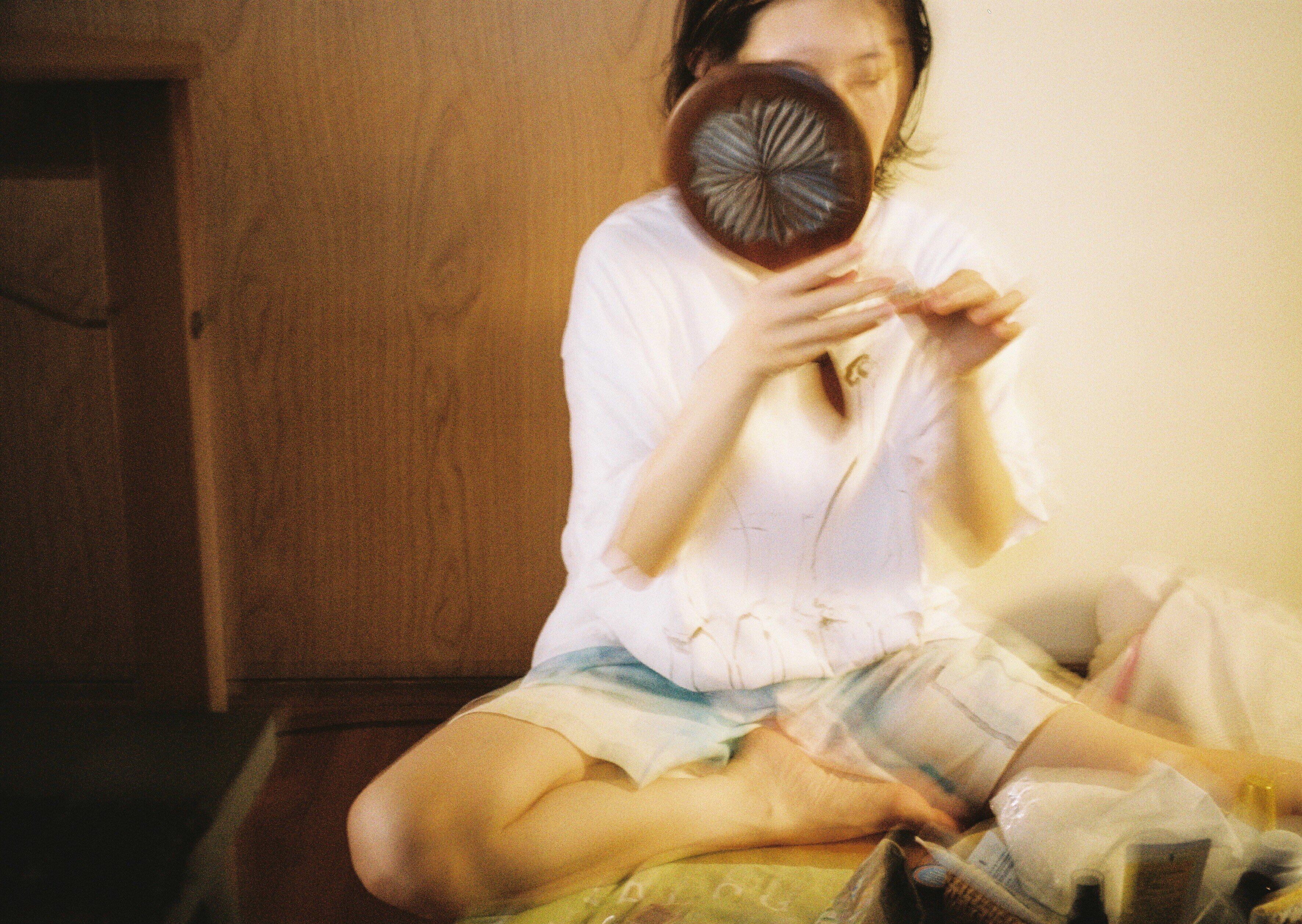 白Tシャツにアンティークゴールドのインクを乗せた、白鳥(しらとり)さん。