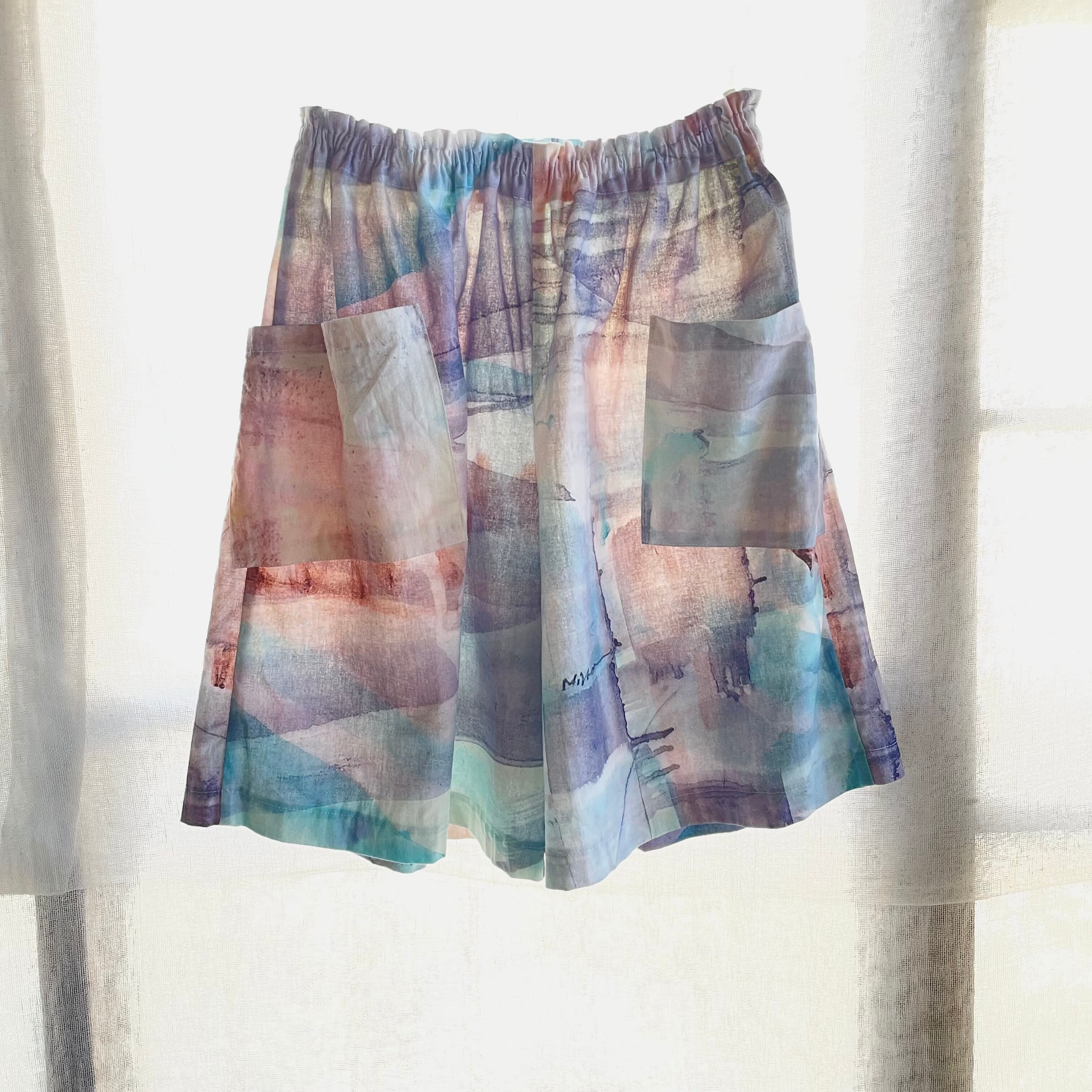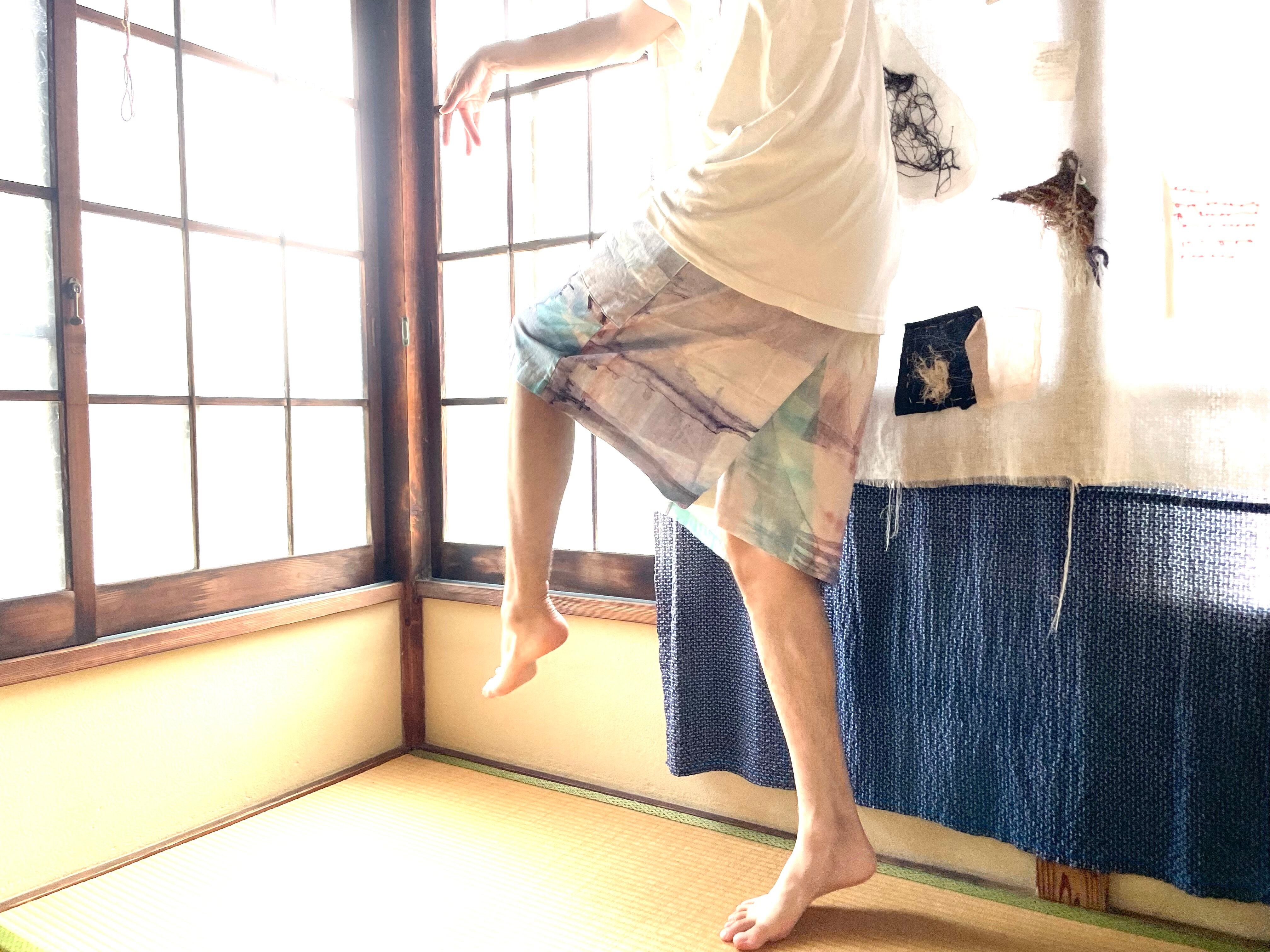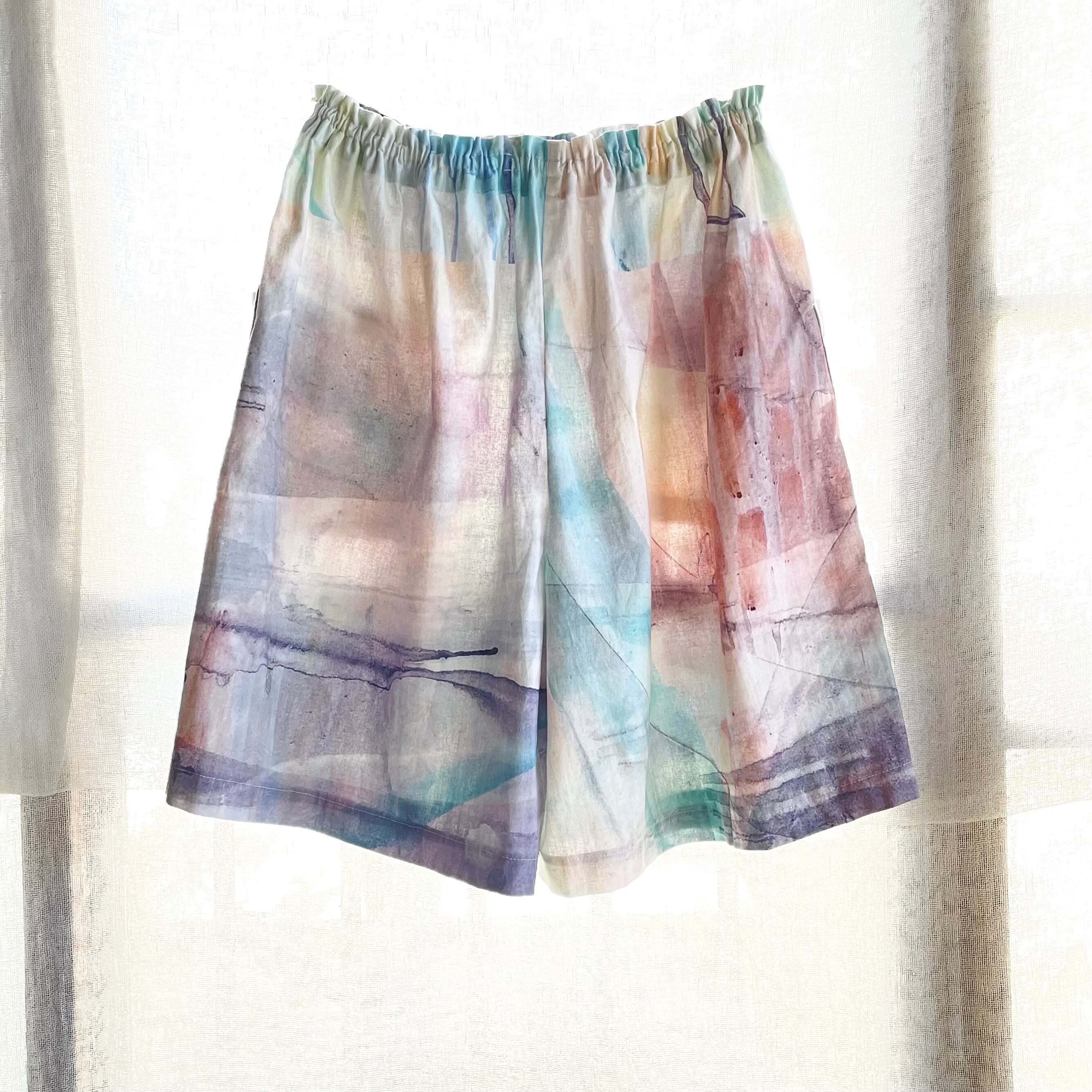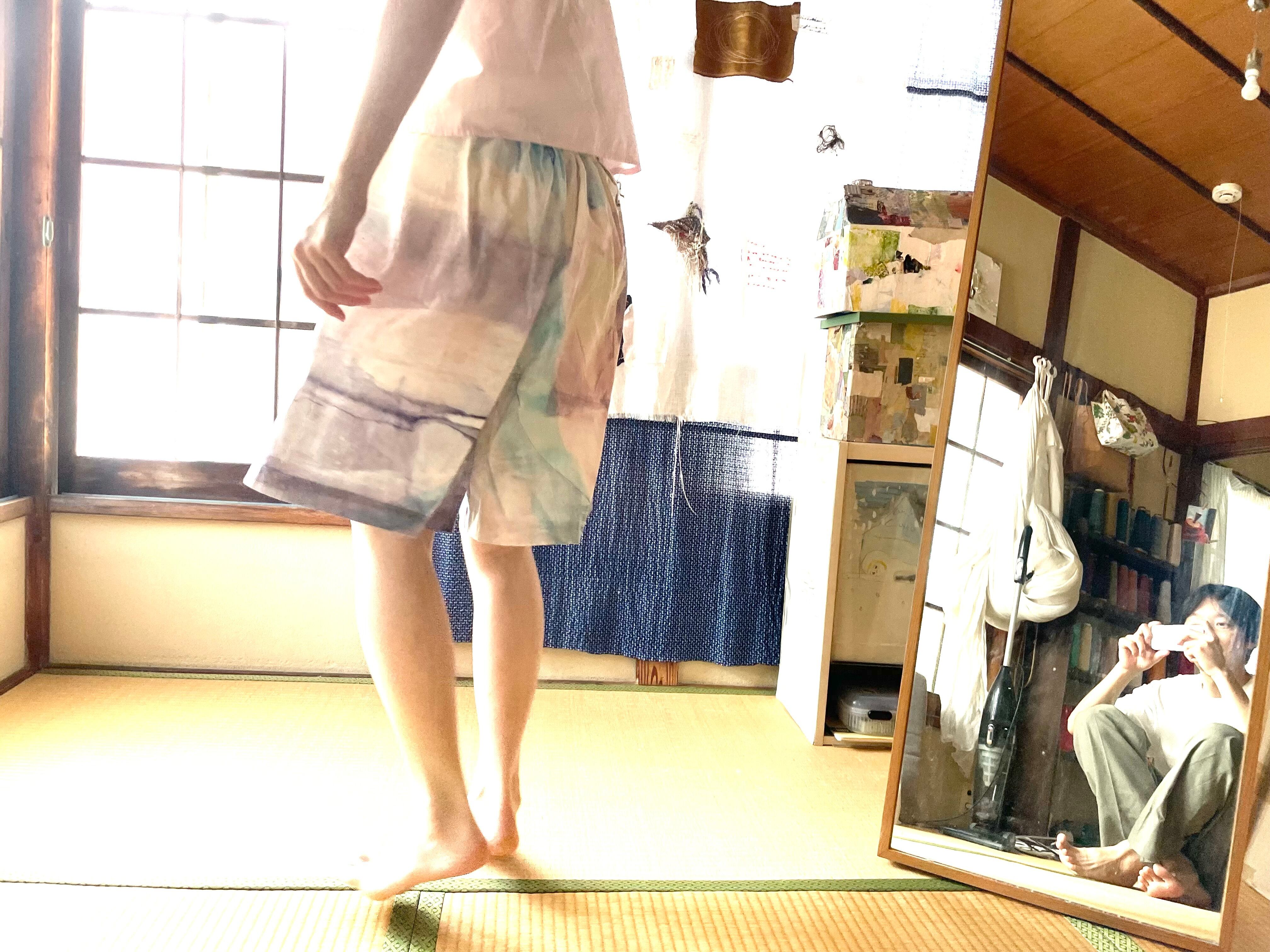 描いた絵を生地にしたいとずっと願っていて、今回、初めて形にすることができました。そして父の誕生日祝いで実家に帰った時、お裁縫好きな母の創作意欲に触れ、“この腕を活かして、私好みなものを作ってほしい”という気持ちが生まれました。幼い頃からずっと、夏の記憶とともに思い出す母のお手製パンツ、オニパン。私の生地で作って貰えたらすごく良いな…